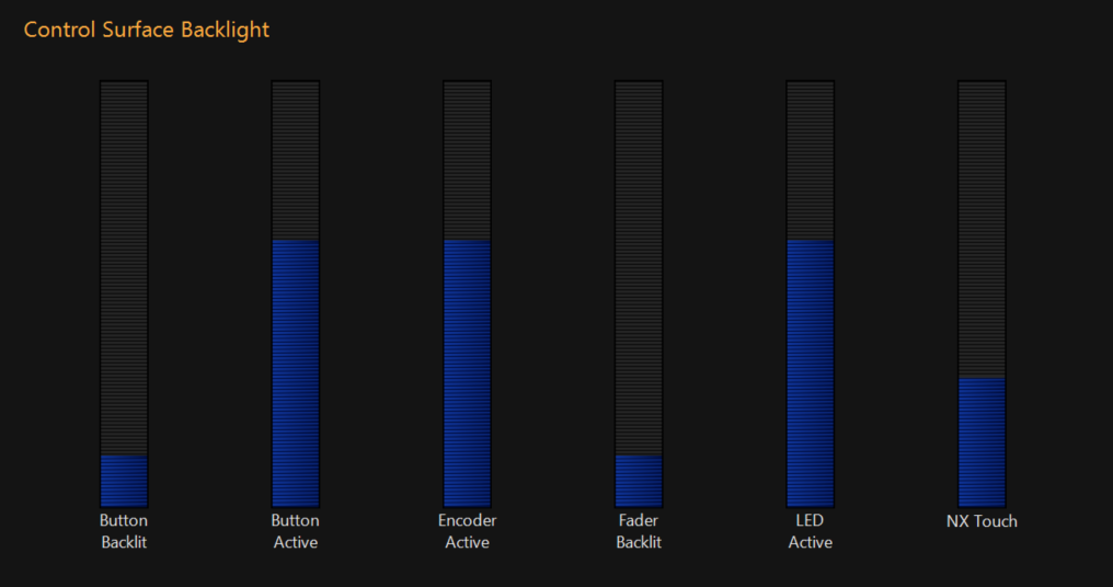 On consoles and wings with RGB backlight faders and buttons, users can configure intensity levels and color options.